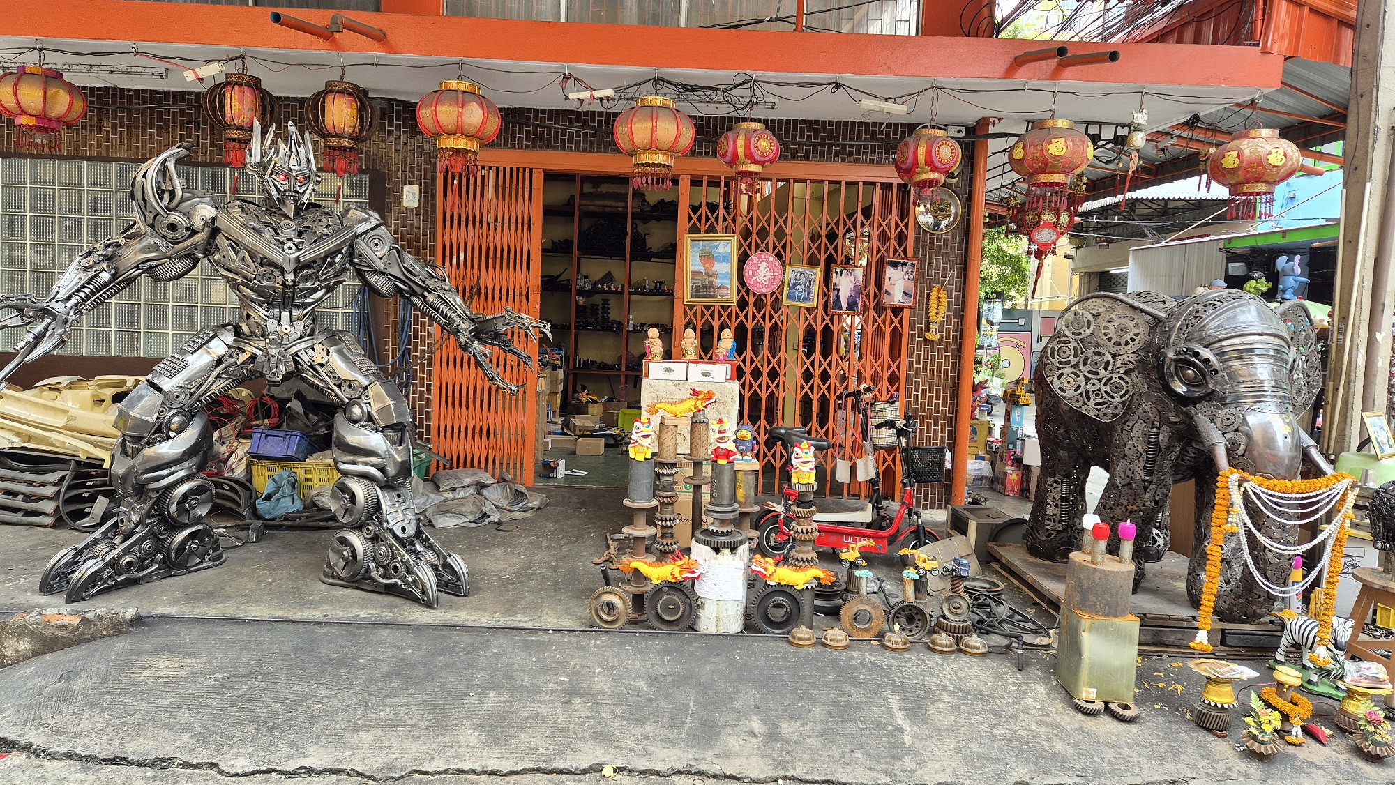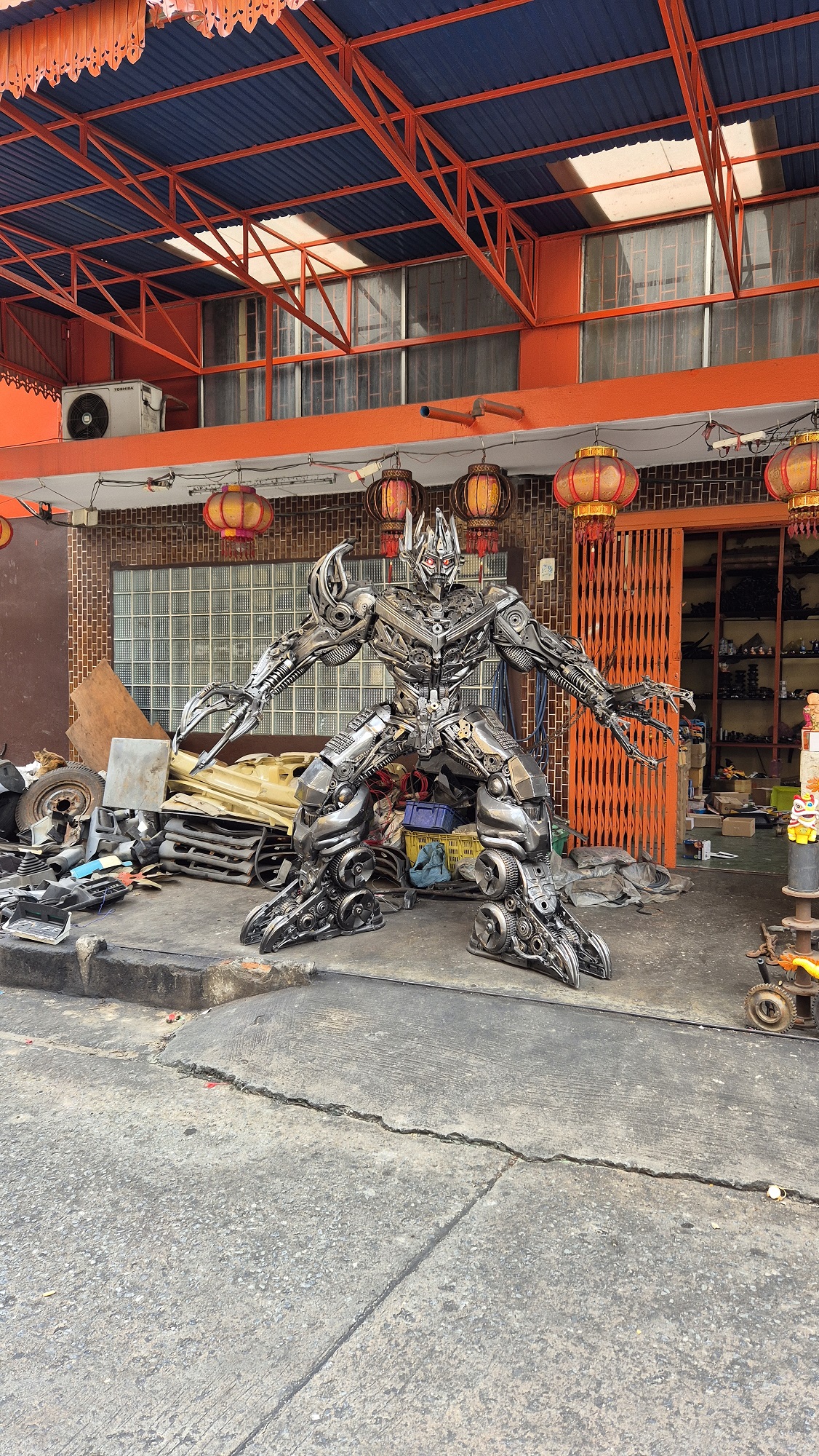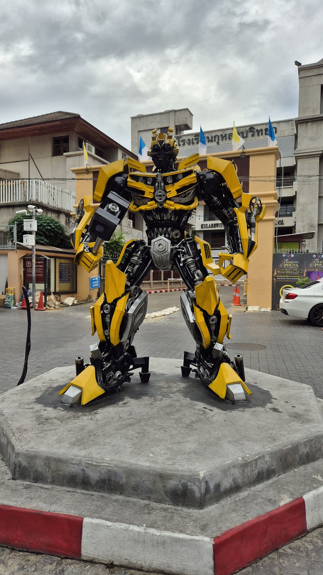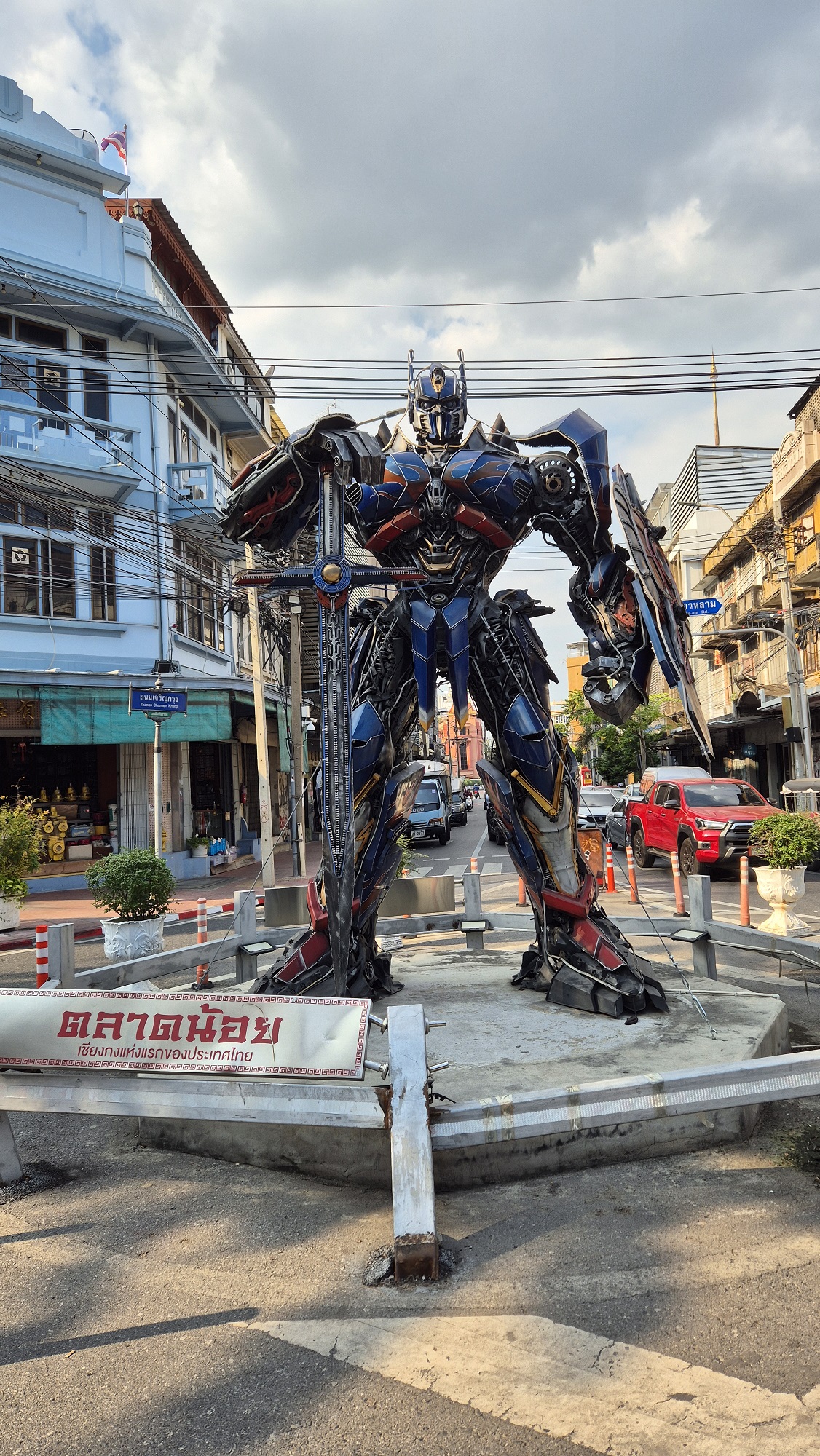 В четвъртък излязох в ранния следобед, минах да направя една снимка на Оптимус Прайм на кръговото на Талат ной (букв. малък пазар) и в 15:45 бях на мястото, където ми казаха. Купих си едно шишенце сок от захарна тръстика и зачаках, докато слушах музика от заведението отсреща, където изглежда празнуваха една година откакто някой се беше преместил в Банкок. Мина 16 часа и отникъде никой не излезе да дава билети. Потърсих в интернет и се оказа, че е имало промяна и сега се взимат от паркинга Чанг. След няколко минути бях там и видях опашка, на която имаше поне петстотин души. Предадох се – не бях психически подготвен и нямах мотивацията да чакам на огромна опашка и след това да обикалям из инсталацията. Направих още няколко снимки из околията, този път на дневна светлина, и си тръгнах.