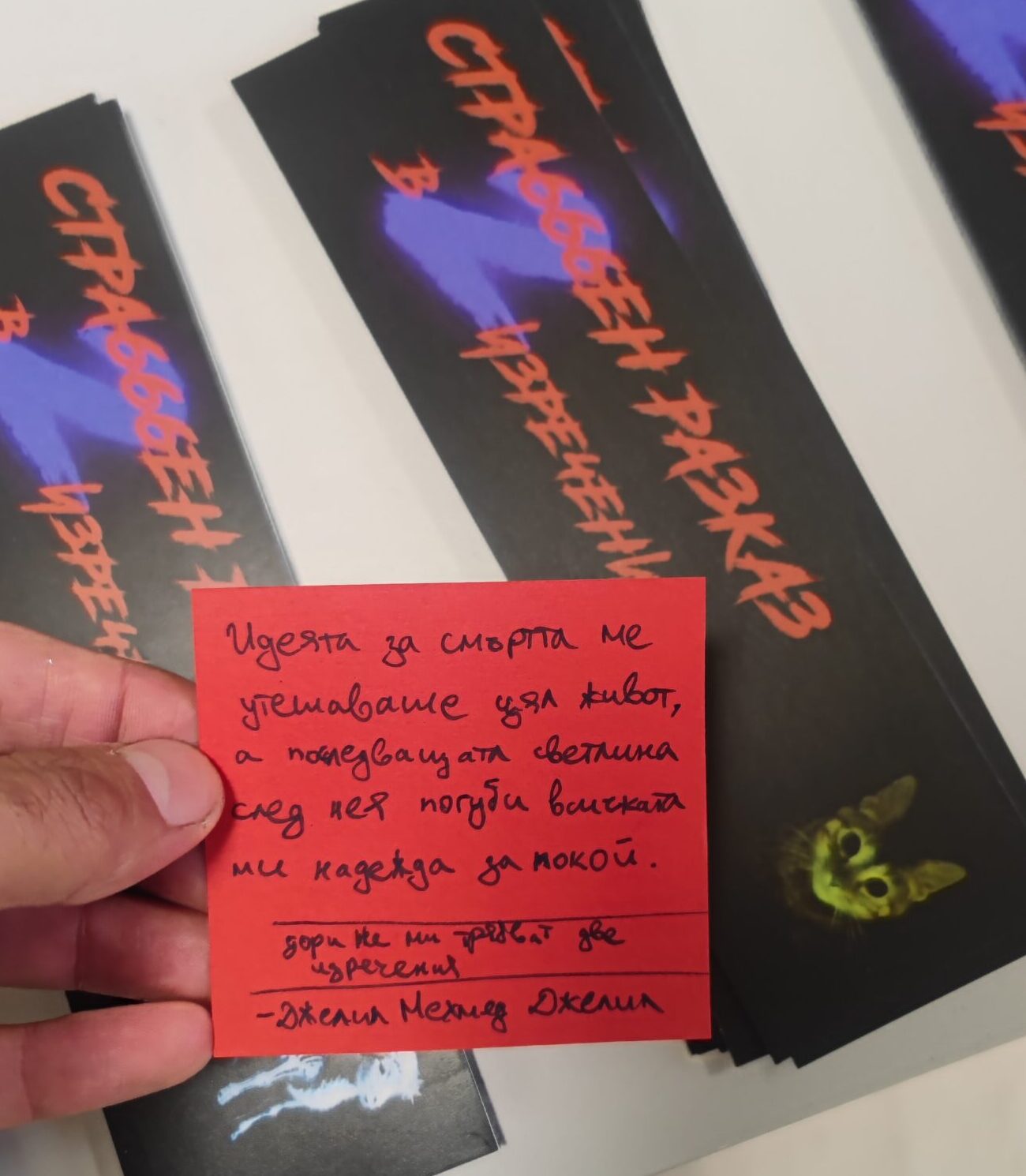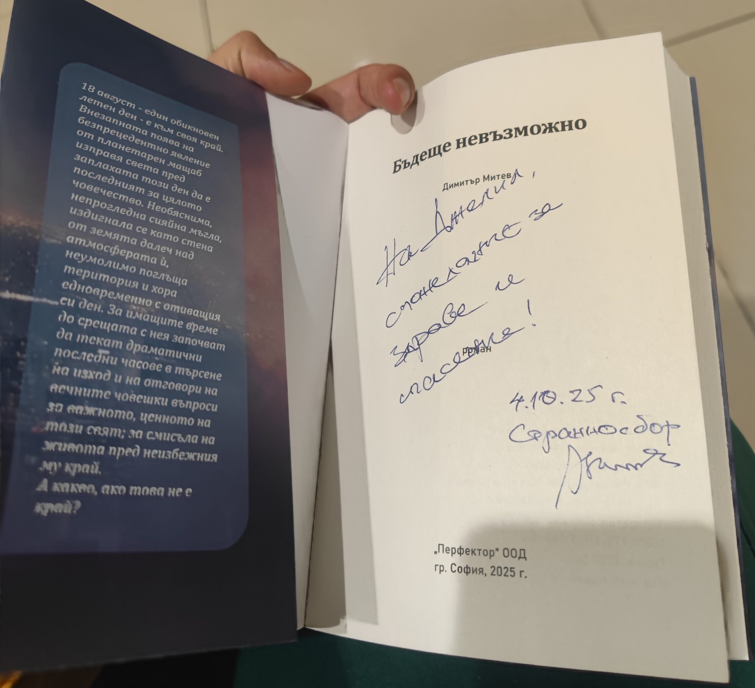 Но държа да отбележа, че сред участниците срещнах и независими издания в щанда на клуб „Аркадий и Борис Стругацки“. Точно там заварих и наскоро самоиздалия се Димитър Митев, чийто фантастичен роман на име „Бъдеще невъзможно“ грабна вниманието ми. Благодарение на сладкодумието и житейските въпроси на писателя, заложих именно на него. Не пропуснах възможността да взема и автографа му.